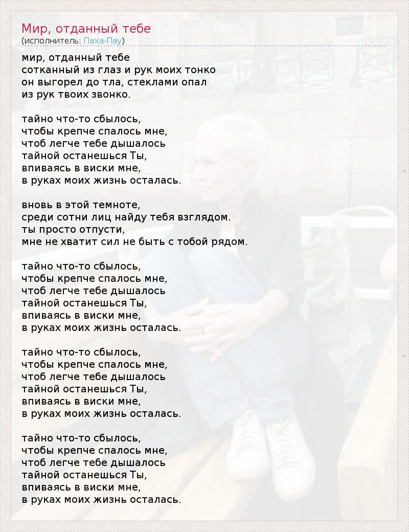 мир, отданный тебе сотканный из глаз и рук моих тонко он выгорел до тла, стеклами опал из рук твоих звонко. тайно что-то сбылось, чтобы крепче спалось мне, чтоб легче тебе дышалось тайной останешься Ты, впиваясь в виски мне, в руках моих жизнь осталась. вновь в этой темноте, среди сотни лиц найду тебя взглядом. ты просто отпусти, мне не хватит сил не быть с тобой рядом. тайно что-то сбылось, чтобы крепче спалось мне, чтоб легче тебе дышалось тайной останешься Ты, впиваясь в виски мне, в руках моих жизнь осталась. тайно что-то сбылось, чтобы крепче спалось мне, чтоб легче тебе дышалось тайной останешься Ты, впиваясь в виски мне, в руках моих жизнь осталась. тайно что-то сбылось, чтобы крепче спалось мне, чтоб легче тебе дышалось тайной останешься Ты, впиваясь в виски мне, в руках моих жизнь осталась.
