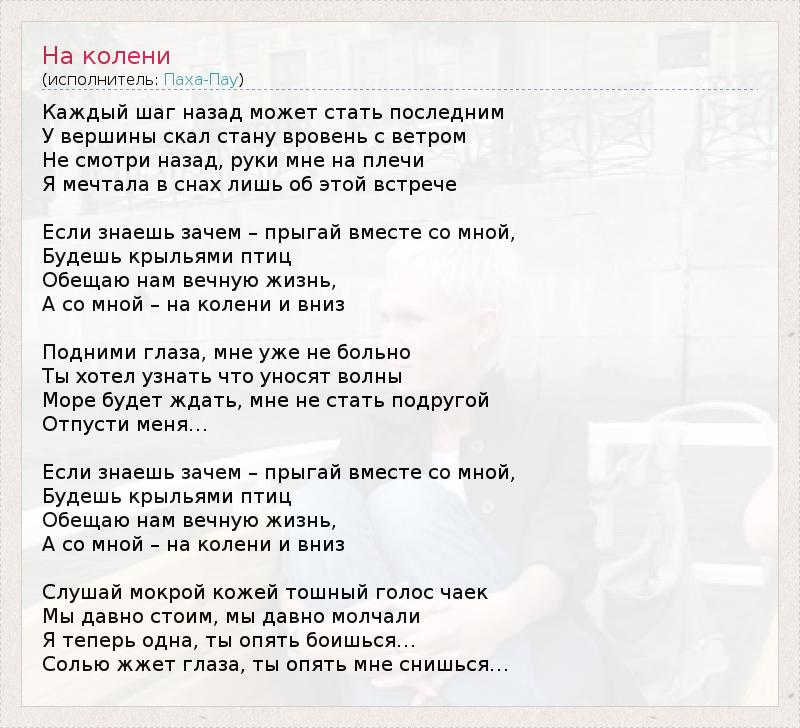 Каждый шаг назад может стать последним У вершины скал стану вровень с ветром Не смотри назад, руки мне на плечи Я мечтала в снах лишь об этой встрече Если знаешь зачем – прыгай вместе со мной, Будешь крыльями птиц Обещаю нам вечную жизнь, А со мной – на колени и вниз Подними глаза, мне уже не больно Ты хотел узнать что уносят волны Море будет ждать, мне не стать подругой Отпусти меня… Если знаешь зачем – прыгай вместе со мной, Будешь крыльями птиц Обещаю нам вечную жизнь, А со мной – на колени и вниз Слушай мокрой кожей тошный голос чаек Мы давно стоим, мы давно молчали Я теперь одна, ты опять боишься… Солью жжет глаза, ты опять мне снишься…
