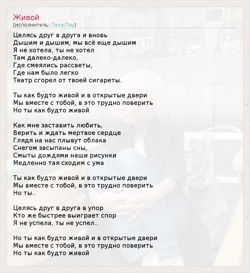 Целясь друг в друга и вновь Дышим и дышим, мы всё еще дышим Я не хотела, ты не хотел Там далеко-далеко, Где смеялись рассветы, Где нам было легко Театр сгорел от твоей сигареты. Ты как будто живой и в открытые двери Мы вместе с тобой, в это трудно поверить Но ты как будто живой Как мне заставить любить, Верить и ждать мертвое сердце Глядя на нас плывут облака Снегом засыпаны сны, Смыты дождями наши рисунки Медленно тая сходим с ума Ты как будто живой и в открытые двери Мы вместе с тобой, в это трудно поверить Но ты.. Целясь друг в друга в упор Кто же быстрее выиграет спор Я не успела, ты не успел.. Но ты как будто живой и в открытые двери Мы вместе с тобой, в это трудно поверить Но ты как будто живой