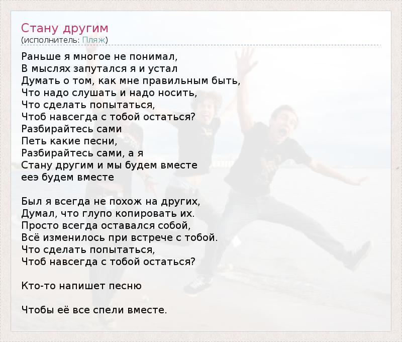 Раньше я многое не понимал, В мыслях запутался я и устал Думать о том, как мне правильным быть, Что надо слушать и надо носить, Что сделать попытаться, Чтоб навсегда с тобой остаться? Разбирайтесь сами Петь какие песни, Разбирайтесь сами, а я Стану другим и мы будем вместе ееэ будем вместе Был я всегда не похож на других, Думал, что глупо копировать их. Просто всегда оставался собой, Всё изменилось при встрече с тобой. Что сделать попытаться, Чтоб навсегда с тобой остаться? Кто-то напишет песню Чтобы её все спели вместе.