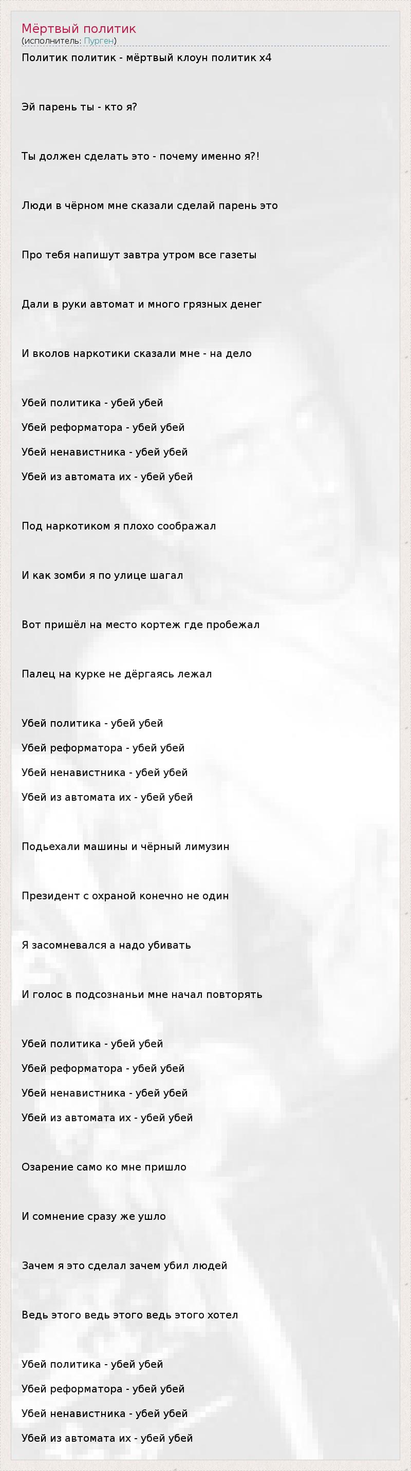 Политик политик - мёртвый клоун политик х4 Эй парень ты - кто я? Ты должен сделать это - почему именно я?! Люди в чёрном мне сказали сделай парень это Про тебя напишут завтра утром все газеты Дали в руки автомат и много грязных денег И вколов наркотики сказали мне - на дело Убей политика - убей убей Убей реформатора - убей убей Убей ненавистника - убей убей Убей из автомата их - убей убей Под наркотиком я плохо соображал И как зомби я по улице шагал Вот пришёл на место кортеж где пробежал Палец на курке не дёргаясь лежал Убей политика - убей убей Убей реформатора - убей убей Убей ненавистника - убей убей Убей из автомата их - убей убей Подьехали машины и чёрный лимузин Президент с охраной конечно не один Я засомневался а надо убивать И голос в подсознаньи мне начал повторять Убей политика - убей убей Убей реформатора - убей убей Убей ненавистника - убей убей Убей из автомата их - убей убей Озарение само ко мне пришло И сомнение сразу же ушло Зачем я это сделал зачем убил людей Ведь этого ведь этого ведь этого хотел Убей политика - убей убей Убей реформатора - убей убей Убей ненавистника - убей убей Убей из автомата их - убей убей