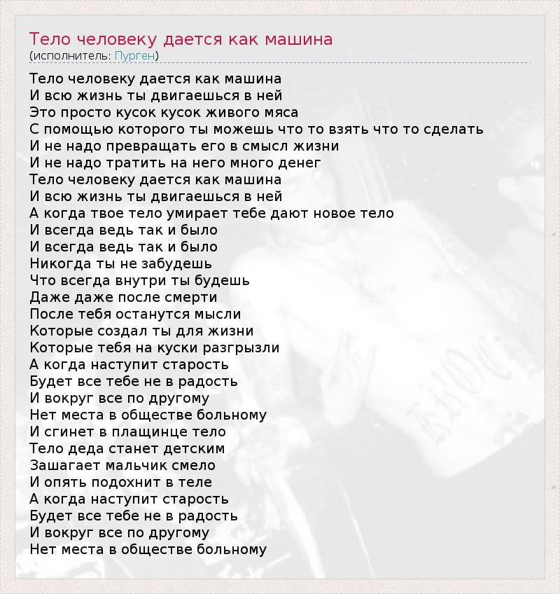 ГлавнаяИсполнителиПургенТело человеку дается как машина