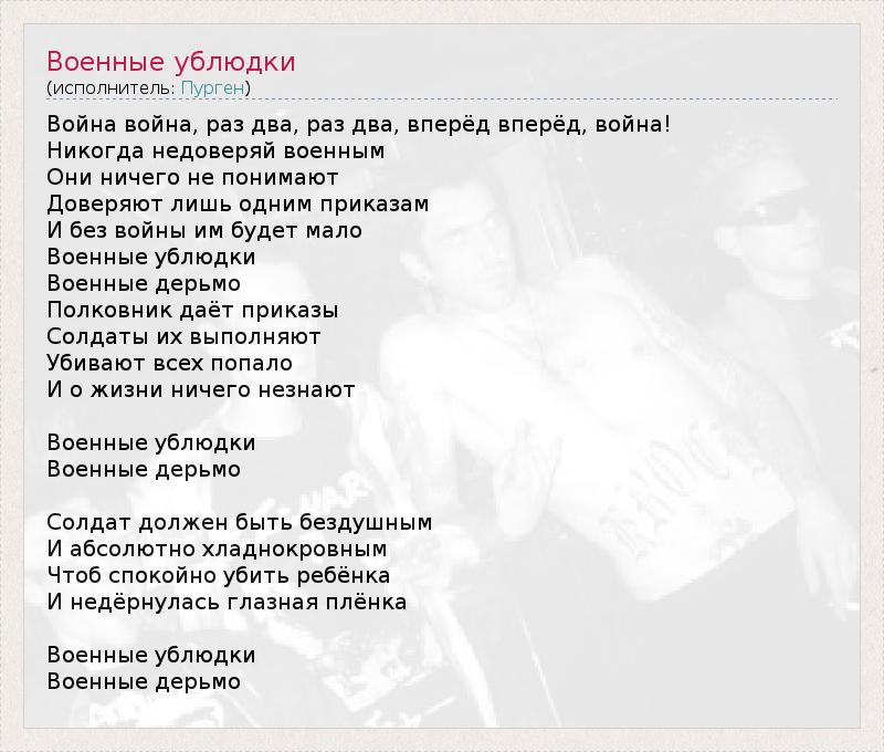 Война война, раз два, раз два, вперёд вперёд, война! Никогда недоверяй военным Они ничего не понимают Доверяют лишь одним приказам И без войны им будет мало Военные ублюдки Военные дерьмо Полковник даёт приказы Солдаты их выполняют Убивают всех попало И о жизни ничего незнают Военные ублюдки Военные дерьмо Солдат должен быть бездушным И абсолютно хладнокровным Чтоб спокойно убить ребёнка И недёрнулась глазная плёнка Военные ублюдки Военные дерьмо