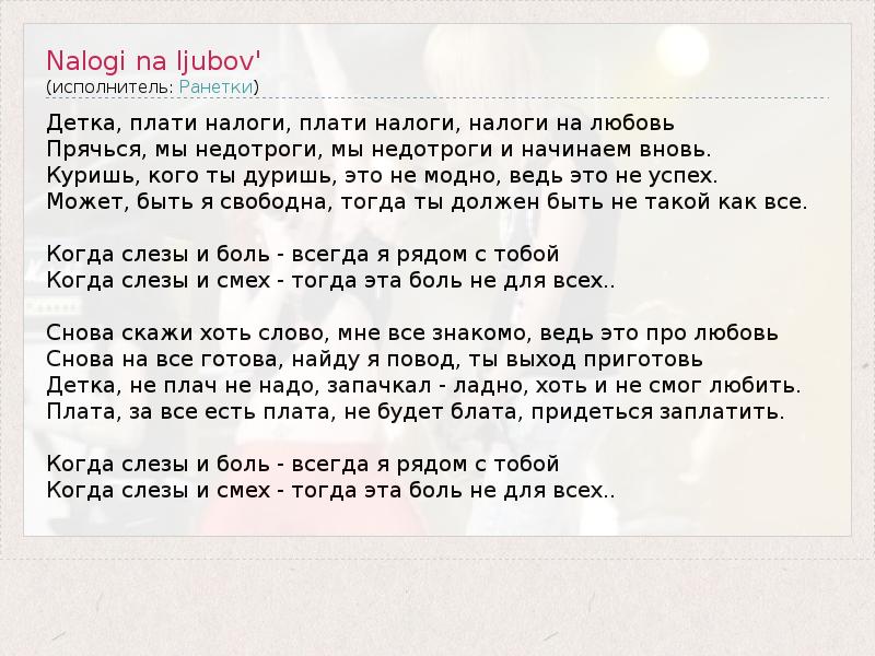 А как ты думаешь, о чем песня "Nalogi na ljubov'" ?