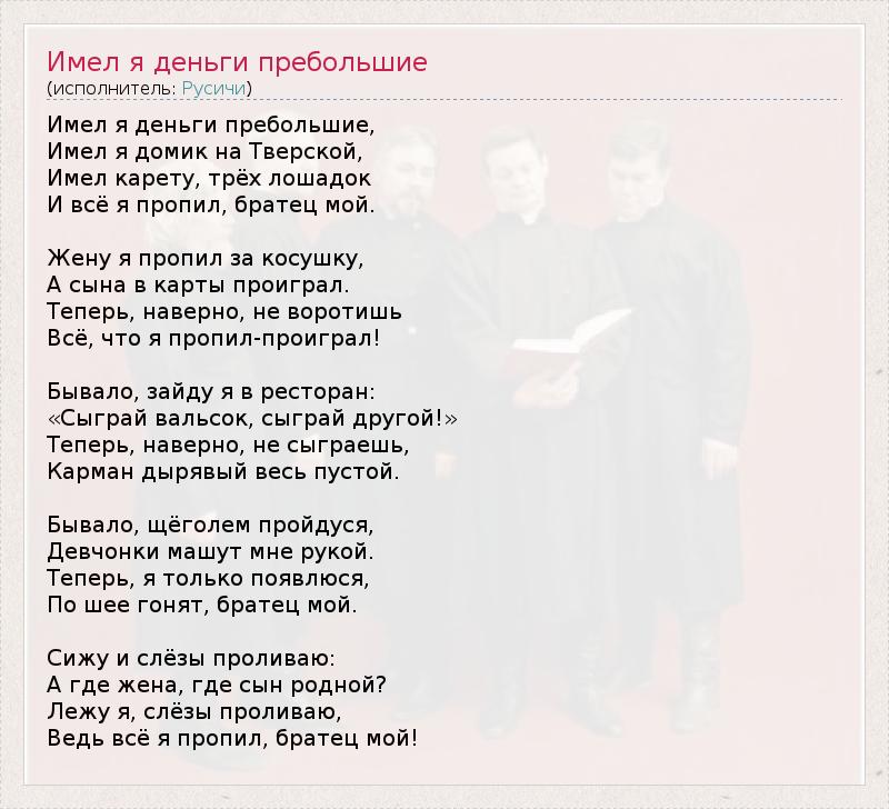 Имел я деньги пребольшие, Имел я домик на Тверской, Имел карету, трёх лошадок И всё я пропил, братец мой. Жену я пропил за косушку, А сына в карты проиграл. Теперь, наверно, не воротишь Всё, что я пропил-проиграл! Бывало, зайду я в ресторан: «Сыграй вальсок, сыграй другой!» Теперь, наверно, не сыграешь, Карман дырявый весь пустой. Бывало, щёголем пройдуся, Девчонки машут мне рукой. Теперь, я только появлюся, По шее гонят, братец мой. Сижу и слёзы проливаю: А где жена, где сын родной? Лежу я, слёзы проливаю, Ведь всё я пропил, братец мой!