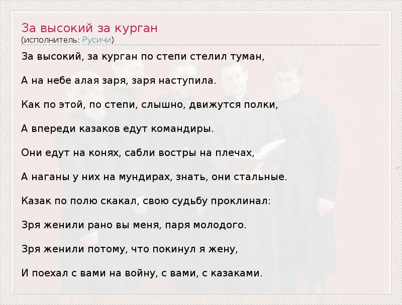 За высокий, за курган по степи стелил туман, А на небе алая заря, заря наступила. Как по этой, по степи, слышно, движутся полки, А впереди казаков едут командиры. Они едут на конях, сабли востры на плечах, А наганы у них на мундирах, знать, они стальные. Казак по полю скакал, свою судьбу проклинал: Зря женили рано вы меня, паря молодого. Зря женили потому, что покинул я жену, И поехал с вами на войну, с вами, с казаками.