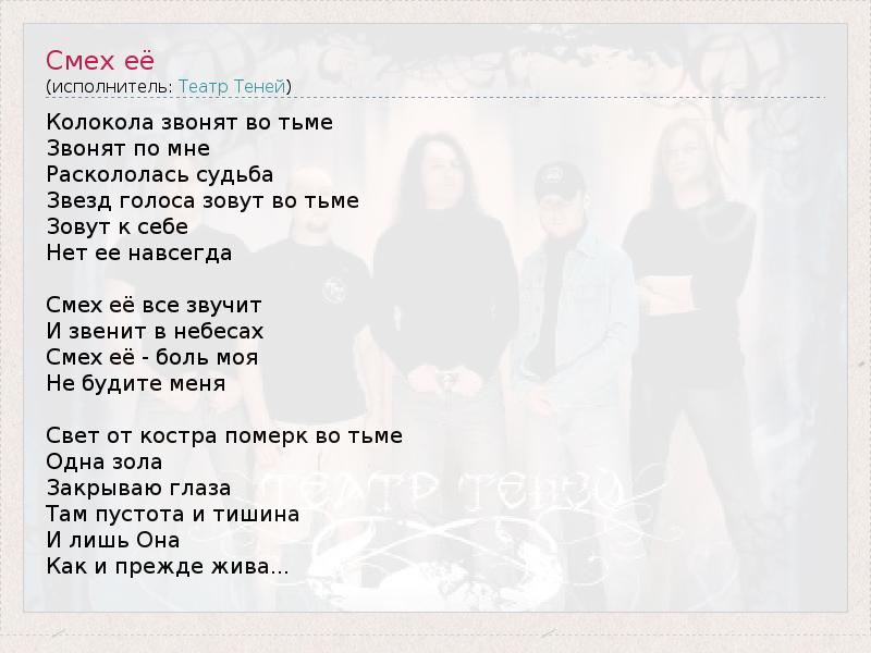 Это интересно:Группа была основана Денисом Машаровым в 1986-ом году.Для начала Театральный репертуар состоял из классики - из тех вещей, которые принадлежат Вечности, которые всегда проникают в самое сердце…Шли годы. Театр Теней подбирал новых актеров. Кто-то уходил из труппы, навсегда унося в своем сердце частичку великолепного спектакля теней…Писались и ставились новые пьесы, пробовались... продолжение