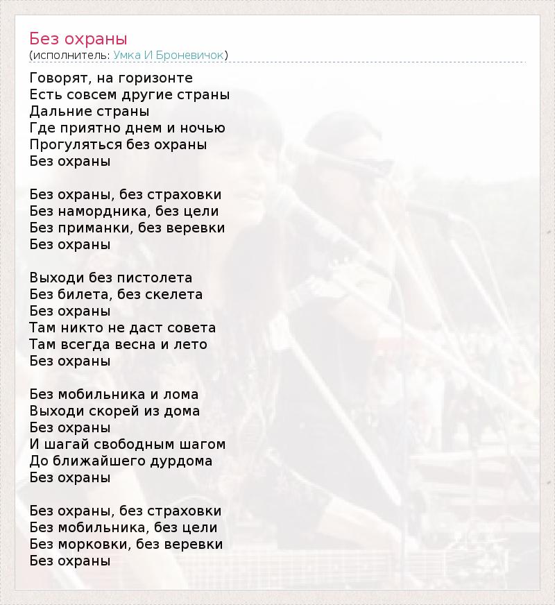 Это интересно:Умка и Броневик (до 2005 — Умка и Броневичок) — творческий союз Умки (Анны Герасимовой) и группы «Броневик» (ранее «Броневичок»). Песни Умки аранжированы в стиле американо-британского гитарного рока 60—70-х, который варьируется от жёсткого ритм-энд-блюза до психоделии а-ля Grateful Dead. Группа выпустила более двух десятков альбомов и много... продолжение