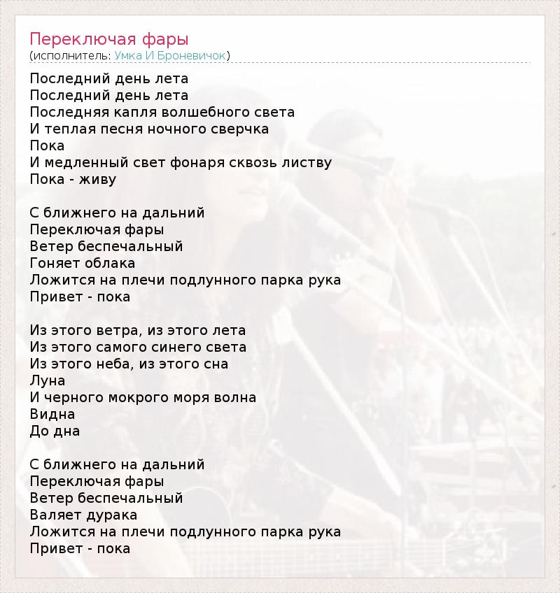 Последний день лета Последний день лета Последняя капля волшебного света И теплая песня ночного сверчка Пока И медленный свет фонаря сквозь листву Пока - живу С ближнего на дальний Переключая фары Ветер беспечальный Гоняет облака Ложится на плечи подлунного парка рука Привет - пока Из этого ветра, из этого лета Из этого самого синего света Из этого неба, из этого сна Луна И черного мокрого моря волна Видна До дна С ближнего на дальний Переключая фары Ветер беспечальный Валяет дурака Ложится на плечи подлунного парка рука Привет - пока