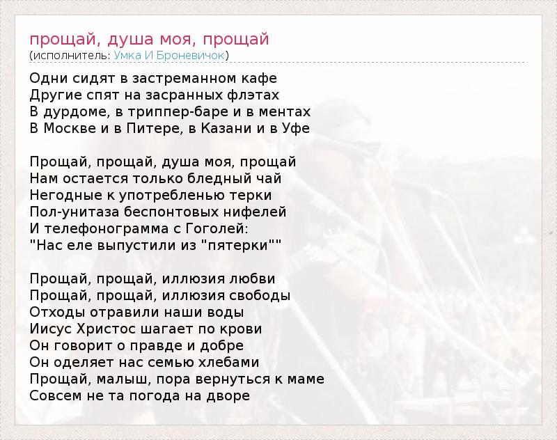 ГлавнаяИсполнителиУмка И Броневичокпрощай, душа моя, прощай
