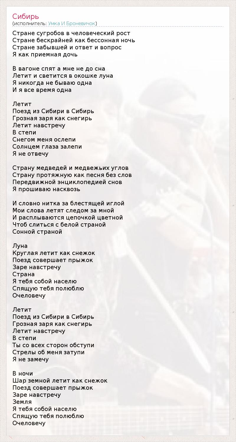 Стране сугробов в человеческий рост Стране бескрайней как бессонная ночь Стране забывшей и ответ и вопрос Я как приемная дочь В вагоне спят а мне не до сна Летит и светится в окошке луна Я никогда не бываю одна И я все время одна Летит Поезд из Сибири в Сибирь Грозная заря как снегирь Летит навстречу В степи Снегом меня ослепи Солнцем глаза залепи Я не отвечу Страну медведей и медвежьих углов Страну протяжную как песня без слов Передвижной энциклопедией снов Я прошиваю насквозь И словно нитка за блестящей иглой Мои слова летят следом за мной И расплываются цепочкой цветной Чтоб слиться с белой страной Сонной страной Луна Круглая летит как снежок Поезд совершает прыжок Заре навстречу Страна Я тебя собой населю Спящую тебя полюблю Очеловечу Летит Поезд из Сибири в Сибирь Грозная заря как снегирь Летит навстречу В степи Ты со всех сторон обступи Стрелы об меня затупи Я не замечу В ночи Шар земной летит как снежок Поезд совершает прыжок Заре навстречу Земля Я тебя собой населю Спящую тебя полюблю Очеловечу