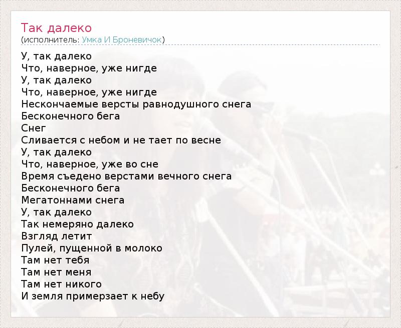 Это интересно:Умка и Броневик (до 2005 — Умка и Броневичок) — творческий союз Умки (Анны Герасимовой) и группы «Броневик» (ранее «Броневичок»). Песни Умки аранжированы в стиле американо-британского гитарного рока 60—70-х, который варьируется от жёсткого ритм-энд-блюза до психоделии а-ля Grateful Dead. Группа выпустила более двух десятков альбомов и много... продолжение
