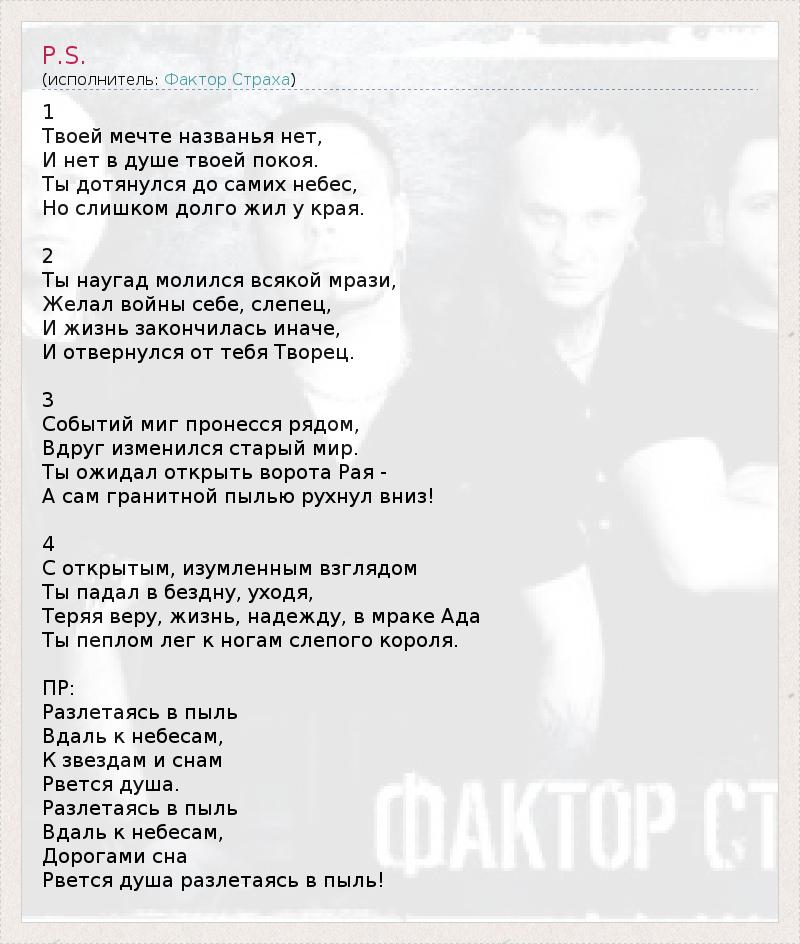1 Твоей мечте названья нет, И нет в душе твоей покоя. Ты дотянулся до самих небес, Но слишком долго жил у края. 2 Ты наугад молился всякой мрази, Желал войны себе, слепец, И жизнь закончилась иначе, И отвернулся от тебя Творец. 3 Событий миг пронесся рядом, Вдруг изменился старый мир. Ты ожидал открыть ворота Рая - А сам гранитной пылью рухнул вниз! 4 С открытым, изумленным взглядом Ты падал в бездну, уходя, Теряя веру, жизнь, надежду, в мраке Ада Ты пеплом лег к ногам слепого короля. ПР: Разлетаясь в пыль Вдаль к небесам, К звездам и снам Рвется душа. Разлетаясь в пыль Вдаль к небесам, Дорогами сна Рвется душа разлетаясь в пыль!