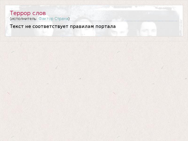 Это интересно:ФАКТОР СТРАХА как коллектив сформировался осенью 2004 года. Участники: Константин "Кот" Селезнев – гитараАлександр "Kuzoff" Кузавов – гитараМихаил Сидоренко – вокал Музыканты знакомы друг с другом больше пятнадцати лет и за это время создали такие группы как: ТРИЗНА, КАРДАННЫЙ ВАЛ, БОНИ НЕМ, ФАКТОР СТРАХА и другие. Они вместе и врозь успели, записать и... продолжение