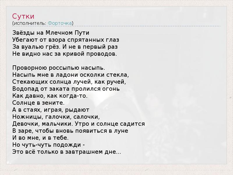 Звёзды на Млечном Пути Убегают от взора спрятанных глаз За вуалью грёз. И не в первый раз Не видно нас за кривой проводов. Проворною россыпью насыпь. Насыпь мне в ладони осколки стекла, Стекающих солнца лучей, как ручей, Водопад от заката пролился огонь Как давно, как когда-то. Солнце в зените. А в стаях, играя, рыдают Ножницы, галочки, салочки, Девочки, мальчики. Утро и солнце садится В заре, чтобы вновь появиться в луне И во мне, и в тебе. Но чуть-чуть подожди - Это всё только в завтрашнем дне...
