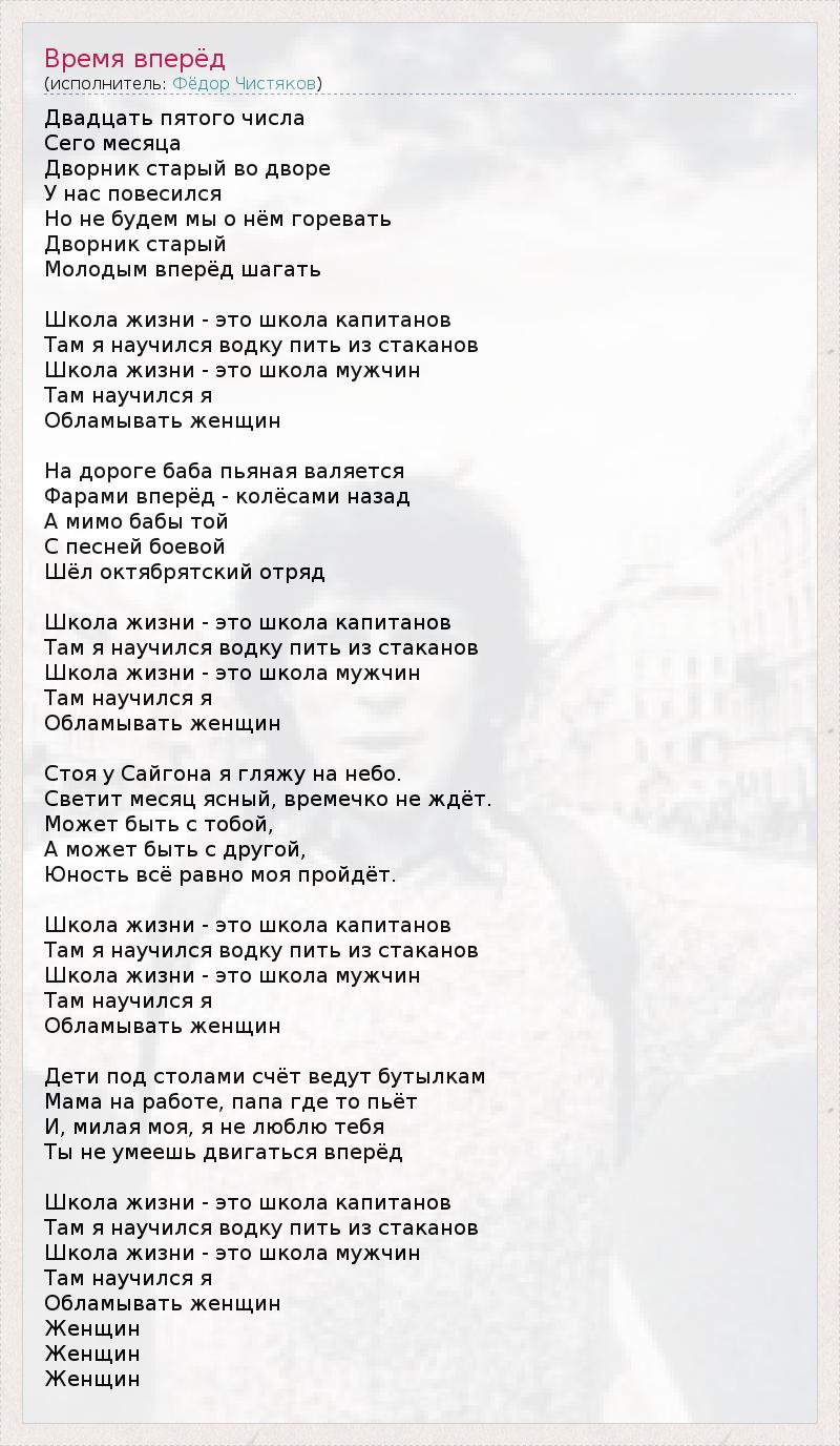 Двадцать пятого числа Сего месяца Дворник старый во дворе У нас повесился Но не будем мы о нём горевать Дворник старый Молодым вперёд шагать Школа жизни - это школа капитанов Там я научился водку пить из стаканов Школа жизни - это школа мужчин Там научился я Обламывать женщин На дороге баба пьяная валяется Фарами вперёд - колёсами назад А мимо бабы той С песней боевой Шёл октябрятский отряд Школа жизни - это школа капитанов Там я научился водку пить из стаканов Школа жизни - это школа мужчин Там научился я Обламывать женщин Стоя у Сайгона я гляжу на небо. Светит месяц ясный, времечко не ждёт. Может быть с тобой, А может быть с другой, Юность всё равно моя пройдёт. Школа жизни - это школа капитанов Там я научился водку пить из стаканов Школа жизни - это школа мужчин Там научился я Обламывать женщин Дети под столами счёт ведут бутылкам Мама на работе, папа где то пьёт И, милая моя, я не люблю тебя Ты не умеешь двигаться вперёд Школа жизни - это школа капитанов Там я научился водку пить из стаканов Школа жизни - это школа мужчин Там научился я Обламывать женщин Женщин Женщин Женщин