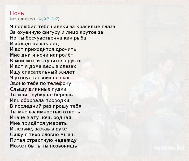 Это интересно:«Хуй Забей» — советская/российская авангардная панк-группа, которую основали в 1989 году школьные друзья «Бигимот» и «Карабас». Ансамбль исполняет панк-рок с нецензурными шуточными текстами, в значительной степени состоящими из мата.До определённого времени тайно, под псевдонимом «Марья Искусница», в записях группы принимала участие певица... продолжение
