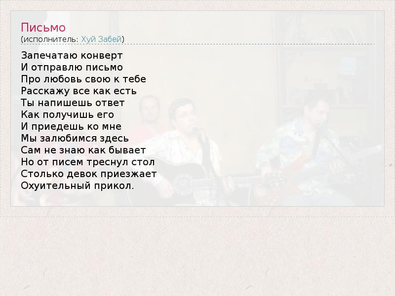 Это интересно:«Хуй Забей» — советская/российская авангардная панк-группа, которую основали в 1989 году школьные друзья «Бигимот» и «Карабас». Ансамбль исполняет панк-рок с нецензурными шуточными текстами, в значительной степени состоящими из мата.До определённого времени тайно, под псевдонимом «Марья Искусница», в записях группы принимала участие певица... продолжение