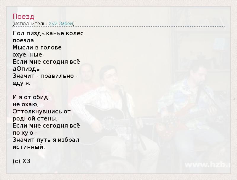 Это интересно:«Хуй Забей» — советская/российская авангардная панк-группа, которую основали в 1989 году школьные друзья «Бигимот» и «Карабас». Ансамбль исполняет панк-рок с нецензурными шуточными текстами, в значительной степени состоящими из мата.До определённого времени тайно, под псевдонимом «Марья Искусница», в записях группы принимала участие певица... продолжение