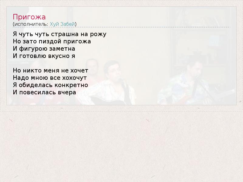 Это интересно:«Хуй Забей» — советская/российская авангардная панк-группа, которую основали в 1989 году школьные друзья «Бигимот» и «Карабас». Ансамбль исполняет панк-рок с нецензурными шуточными текстами, в значительной степени состоящими из мата.До определённого времени тайно, под псевдонимом «Марья Искусница», в записях группы принимала участие певица... продолжение