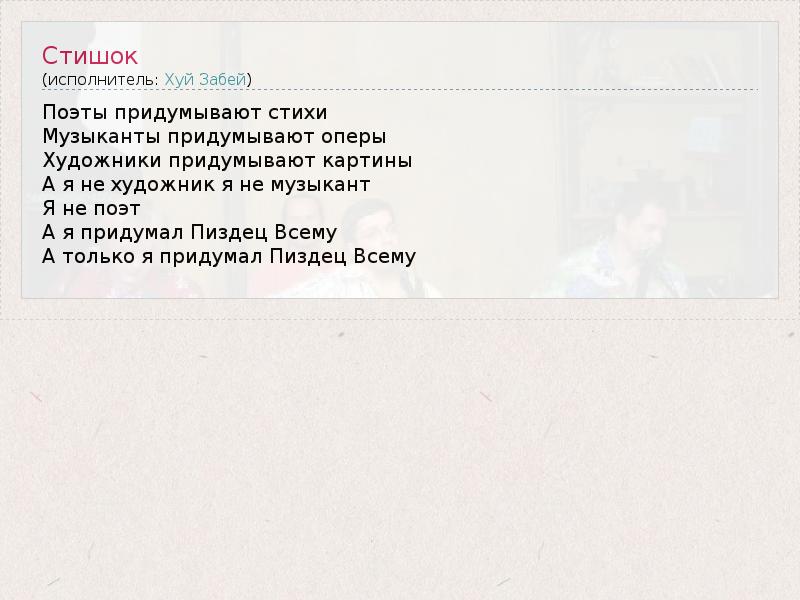 Это интересно:«Хуй Забей» — советская/российская авангардная панк-группа, которую основали в 1989 году школьные друзья «Бигимот» и «Карабас». Ансамбль исполняет панк-рок с нецензурными шуточными текстами, в значительной степени состоящими из мата.До определённого времени тайно, под псевдонимом «Марья Искусница», в записях группы принимала участие певица... продолжение