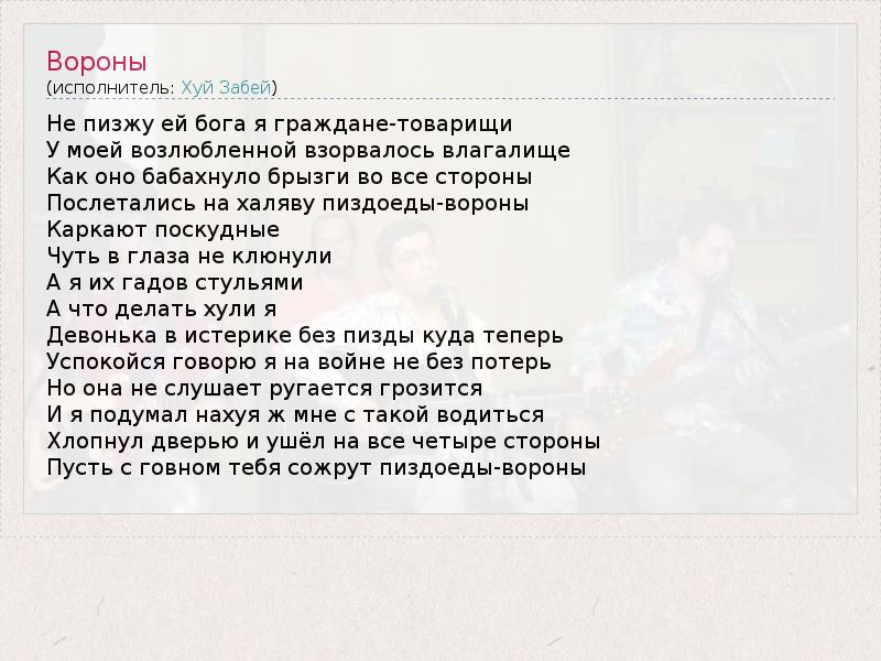 Это интересно:«Хуй Забей» — советская/российская авангардная панк-группа, которую основали в 1989 году школьные друзья «Бигимот» и «Карабас». Ансамбль исполняет панк-рок с нецензурными шуточными текстами, в значительной степени состоящими из мата.До определённого времени тайно, под псевдонимом «Марья Искусница», в записях группы принимала участие певица... продолжение