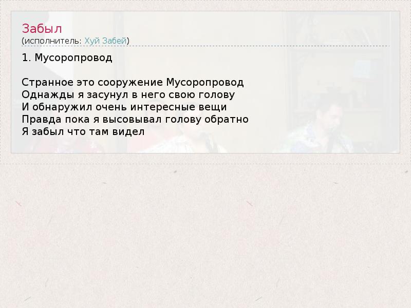 Это интересно:«Хуй Забей» — советская/российская авангардная панк-группа, которую основали в 1989 году школьные друзья «Бигимот» и «Карабас». Ансамбль исполняет панк-рок с нецензурными шуточными текстами, в значительной степени состоящими из мата.До определённого времени тайно, под псевдонимом «Марья Искусница», в записях группы принимала участие певица... продолжение