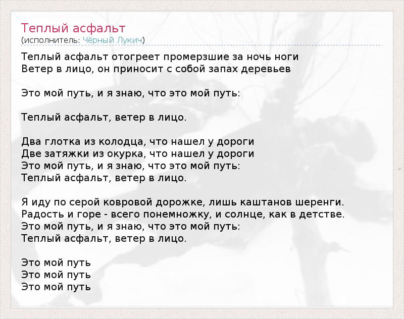 Теплый асфальт отогреет промерзшие за ночь ноги Ветер в лицо, он приносит с собой запах деревьев Это мой путь, и я знаю, что это мой путь: Теплый асфальт, ветер в лицо. Два глотка из колодца, что нашел у дороги Две затяжки из окурка, что нашел у дороги Это мой путь, и я знаю, что это мой путь: Теплый асфальт, ветер в лицо. Я иду по серой ковровой дорожке, лишь каштанов шеренги. Радость и горе - всего понемножку, и солнце, как в детстве. Это мой путь, и я знаю, что это мой путь: Теплый асфальт, ветер в лицо. Это мой путь Это мой путь Это мой путь