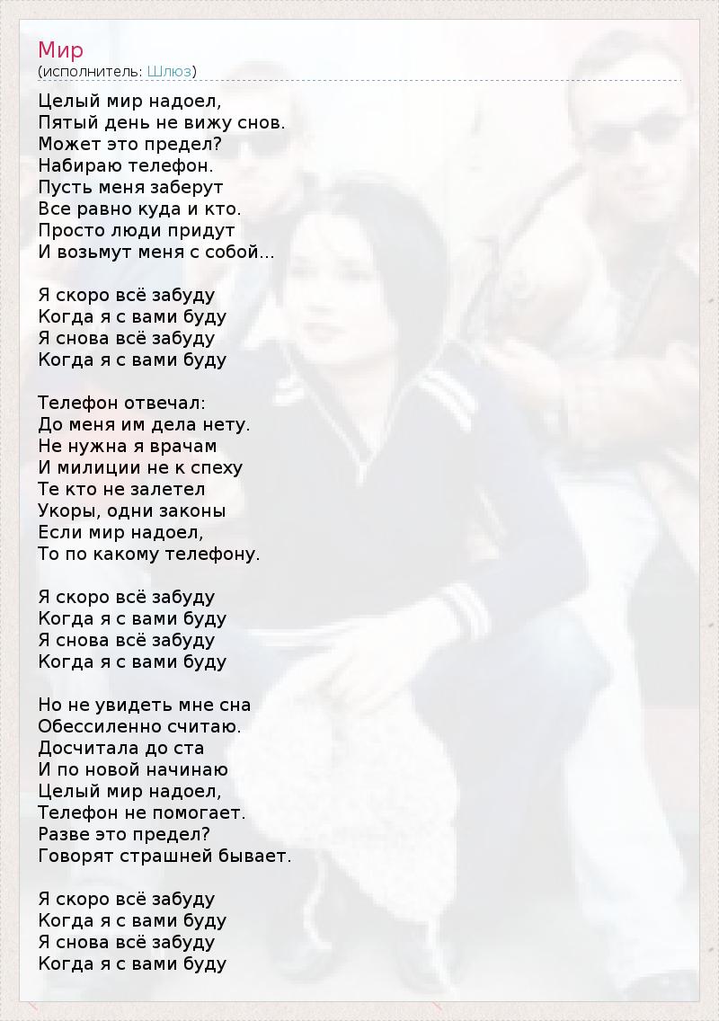 Это интересно:Группа «Шлюз» была основана осенью 1999 года в Москве. В первоначальный состав входили: Аксана Цветы - вокал, Александр Усачёв - гитара, Владислав Тарасов - бас-гитара, Алексей Смирнов - ударные, Владислав Дашкевич - труба, Александр Кузнецов - тромбон.В том же году группа выпускает дебютный альбом «Гады» на независимом лейбле (в 2000 он был переиздан фирмой грамзаписи Фили/FeeLee Record Company).В... продолжение