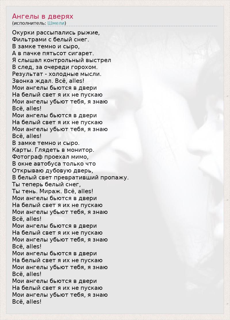 Окурки рассыпались рыжие, Фильтрами с белый снег. В замке темно и сыро, А в пачке пятьсот сигарет. Я слышал контрольный выстрел В след, за очереди горохом. Результат - холодные мысли. Звонка ждал. Всё, alles! Мои ангелы бьются в двери На белый свет я их не пускаю Мои ангелы убьют тебя, я знаю Всё, alles! Мои ангелы бьются в двери На белый свет я их не пускаю Мои ангелы убьют тебя, я знаю Всё, alles! В замке темно и сыро. Карты. Глядеть в монитор. Фотограф проехал мимо, В окне автобуса только что Открываю дубовую дверь, В белый свет превративший пропажу. Ты теперь белый снег, Ты тень. Мираж. Всё, alles! Мои ангелы бьются в двери На белый свет я их не пускаю Мои ангелы убьют тебя, я знаю Всё, alles! Мои ангелы бьются в двери На белый свет я их не пускаю Мои ангелы убьют тебя, я знаю Всё, alles! Мои ангелы бьются в двери На белый свет я их не пускаю Мои ангелы убьют тебя, я знаю Всё, alles! Мои ангелы бьются в двери На белый свет я их не пускаю Мои ангелы убьют тебя, я знаю Всё, alles!