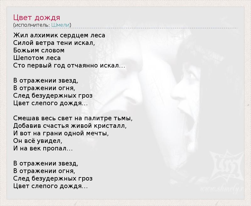 Жил алхимик сердцем леса Силой ветра тени искал, Божьим словом Шепотом леса Сто первый год отчаянно искал… В отражении звезд, В отражении огня, След безудержных гроз Цвет слепого дождя… Смешав весь свет на палитре тьмы, Добавив счастья живой кристалл, И вот на грани одной мечты, Он всё увидел, И на век пропал… В отражении звезд, В отражении огня, След безудержных гроз Цвет слепого дождя…