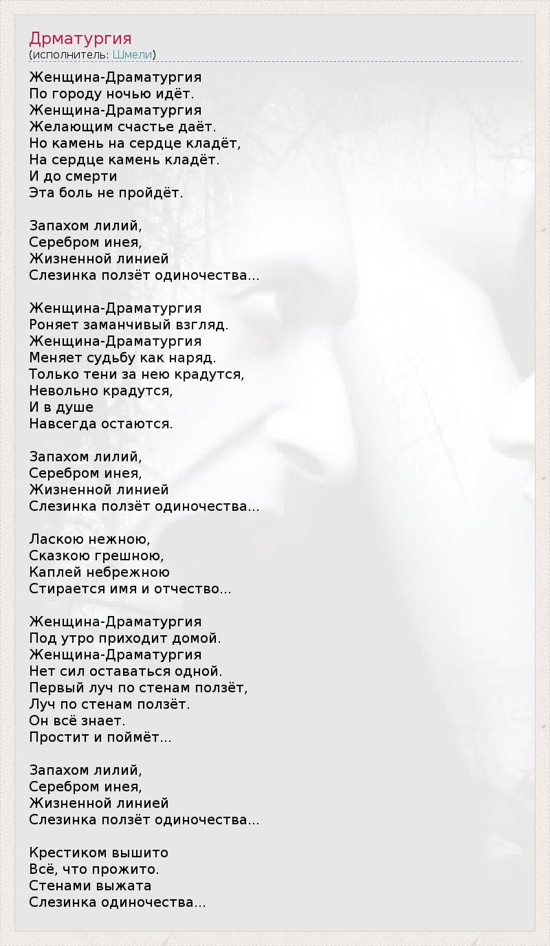Женщина-Драматургия По городу ночью идёт. Женщина-Драматургия Желающим счастье даёт. Но камень на сердце кладёт, На сердце камень кладёт. И до смерти Эта боль не пройдёт. Запахом лилий, Серебром инея, Жизненной линией Слезинка ползёт одиночества... Женщина-Драматургия Роняет заманчивый взгляд. Женщина-Драматургия Меняет судьбу как наряд. Только тени за нею крадутся, Невольно крадутся, И в душе Навсегда остаются. Запахом лилий, Серебром инея, Жизненной линией Слезинка ползёт одиночества... Ласкою нежною, Сказкою грешною, Каплей небрежною Стирается имя и отчество... Женщина-Драматургия Под утро приходит домой. Женщина-Драматургия Нет сил оставаться одной. Первый луч по стенам ползёт, Луч по стенам ползёт. Он всё знает. Простит и поймёт... Запахом лилий, Серебром инея, Жизненной линией Слезинка ползёт одиночества... Крестиком вышито Всё, что прожито. Стенами выжата Слезинка одиночества...