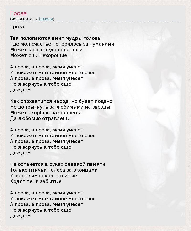 Гроза Так полопаются вмиг мудры головы Где мол счастье потерялось за туманами Может крест недоношенный Может сны нехорошие А гроза, а гроза, меня унесет И покажет мне тайное место свое А гроза, а гроза, меня унесет Но я вернусь к тебе еще Дождем Как спохватится народ, но будет поздно Не допрыгнуть за любимыми на звезды Может скорбью разбавлены Да любовью отравлены А гроза, а гроза, меня унесет И покажет мне тайное место свое А гроза, а гроза, меня унесет Но я вернусь к тебе еще Дождем Не останется в руках сладкой памяти Только птичьи голоса за оконцами И мёртвым соком политые Ходят тени забытые А гроза, а гроза, меня унесет И покажет мне тайное место свое А гроза, а гроза, меня унесет Но я вернусь к тебе еще Дождем