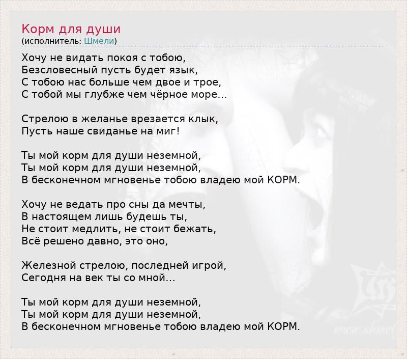Хочу не видать покоя с тобою, Безсловесный пусть будет язык, С тобою нас больше чем двое и трое, С тобой мы глубже чем чёрное море… Стрелою в желанье врезается клык, Пусть наше свиданье на миг! Ты мой корм для души неземной, Ты мой корм для души неземной, В бесконечном мгновенье тобою владею мой КОРМ. Хочу не ведать про сны да мечты, В настоящем лишь будешь ты, Не стоит медлить, не стоит бежать, Всё решено давно, это оно, Железной стрелою, последней игрой, Сегодня на век ты со мной… Ты мой корм для души неземной, Ты мой корм для души неземной, В бесконечном мгновенье тобою владею мой КОРМ.