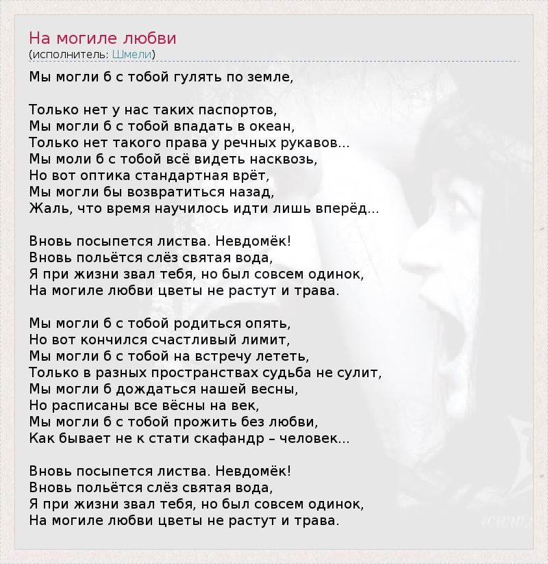 Мы могли б с тобой гулять по земле, Только нет у нас таких паспортов, Мы могли б с тобой впадать в океан, Только нет такого права у речных рукавов... Мы моли б с тобой всё видеть насквозь, Но вот оптика стандартная врёт, Мы могли бы возвратиться назад, Жаль, что время научилось идти лишь вперёд... Вновь посыпется листва. Невдомёк! Вновь польётся слёз святая вода, Я при жизни звал тебя, но был совсем одинок, На могиле любви цветы не растут и трава. Мы могли б с тобой родиться опять, Но вот кончился счастливый лимит, Мы могли б с тобой на встречу лететь, Только в разных пространствах судьба не сулит, Мы могли б дождаться нашей весны, Но расписаны все вёсны на век, Мы могли б с тобой прожить без любви, Как бывает не к стати скафандр – человек... Вновь посыпется листва. Невдомёк! Вновь польётся слёз святая вода, Я при жизни звал тебя, но был совсем одинок, На могиле любви цветы не растут и трава.
