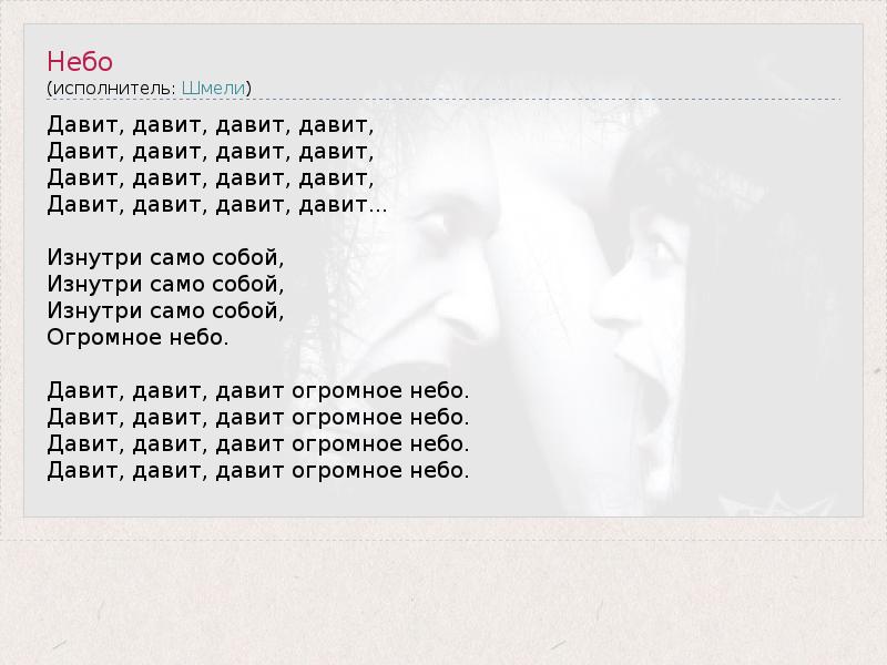 Давит, давит, давит, давит, Давит, давит, давит, давит, Давит, давит, давит, давит, Давит, давит, давит, давит... Изнутри само собой, Изнутри само собой, Изнутри само собой, Огромное небо. Давит, давит, давит огромное небо. Давит, давит, давит огромное небо. Давит, давит, давит огромное небо. Давит, давит, давит огромное небо.