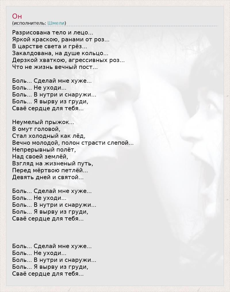 Разрисована тело и лецо... Яркой краскою, ранами от роз... В царстве света и грёз... Закалдована, на душе кольцо... Дерзкой хваткою, агрессивных роз... Что не жизнь вечный пост... Боль... Сделай мне хуже... Боль... Не уходи... Боль... В нутри и снаружи... Боль... Я вырву из груди, Сваё сердце для тебя... Неумелый прыжок... В омут головой, Стал холодный как лёд, Вечно молодой, полон страсти слепой... Непрерывный полёт, Над своей землёй, Взгляд на жизненый путь, Перед мёртвою петлёй... Девять дней и святой... Боль... Сделай мне хуже... Боль... Не уходи... Боль... В нутри и снаружи... Боль... Я вырву из груди, Сваё сердце для тебя... Боль... Сделай мне хуже... Боль... Не уходи... Боль... В нутри и снаружи... Боль... Я вырву из груди, Сваё сердце для тебя...