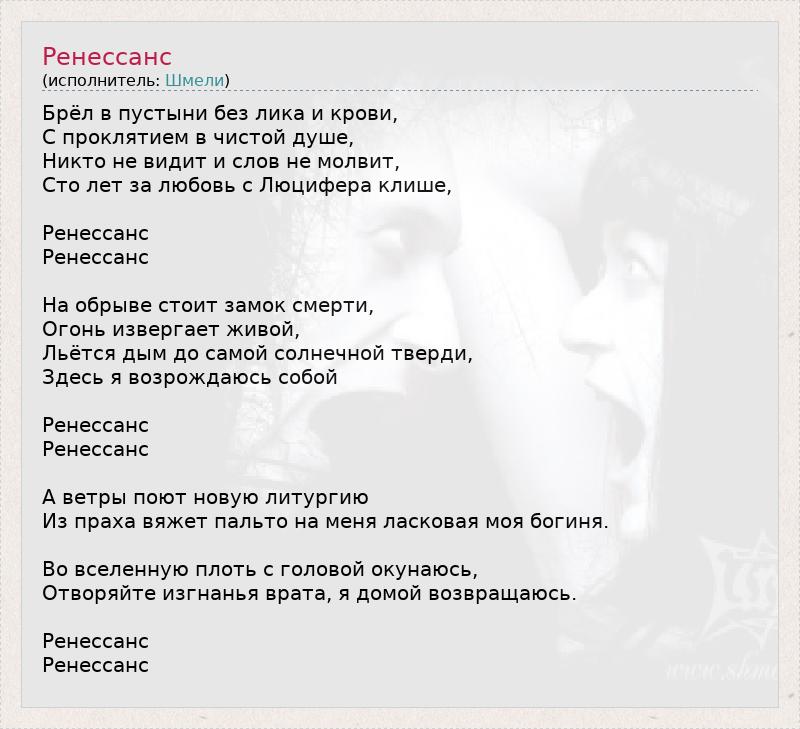 Брёл в пустыни без лика и крови, С проклятием в чистой душе, Никто не видит и слов не молвит, Сто лет за любовь с Люцифера клише, Ренессанс Ренессанс На обрыве стоит замок смерти, Огонь извергает живой, Льётся дым до самой солнечной тверди, Здесь я возрождаюсь собой Ренессанс Ренессанс А ветры поют новую литургию Из праха вяжет пальто на меня ласковая моя богиня. Во вселенную плоть с головой окунаюсь, Отворяйте изгнанья врата, я домой возвращаюсь. Ренессанс Ренессанс