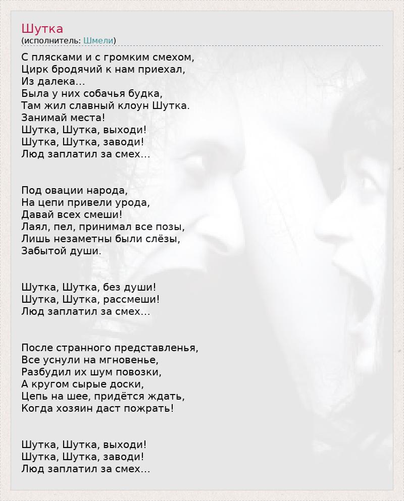 С плясками и с громким смехом, Цирк бродячий к нам приехал, Из далека… Была у них собачья будка, Там жил славный клоун Шутка. Занимай места! Шутка, Шутка, выходи! Шутка, Шутка, заводи! Люд заплатил за смех… Под овации народа, На цепи привели урода, Давай всех смеши! Лаял, пел, принимал все позы, Лишь незаметны были слёзы, Забытой души. Шутка, Шутка, без души! Шутка, Шутка, рассмеши! Люд заплатил за смех… После странного представленья, Все уснули на мгновенье, Разбудил их шум повозки, А кругом сырые доски, Цепь на шее, придётся ждать, Когда хозяин даст пожрать! Шутка, Шутка, выходи! Шутка, Шутка, заводи! Люд заплатил за смех…