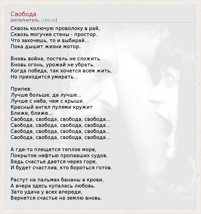 Сквозь колючую проволоку в рай, Сквозь могучие стены - простор. Что захочешь, то и выбирай... Пока дышит жизни мотор. Вновь война, постель не сложить. Вновь огонь, урожай не убрать. Когда победа, так хочется всем жить, Но приходится умирать... Припев: Лучше больше, да лучше... Лучше с неба, чем с крыши. Красный ангел пулями кружит Ближе, ближе... Свобода, свобода, свобода, свобода... Свобода, свобода, свобода, свобода... Свобода, свобода, свобода, свобода... Свобода, свобода, свобода, свобода... А где-то плещется теплое море, Покрытое нефтью пропавших судов. Ведь счастье дается через горе, И будет счастлив, кто бороться готов. Растут на пальмах бананы в крови, А вчера здесь купалась любовь. Зато удача у всех впереди, Вернется счастье на землю вновь.