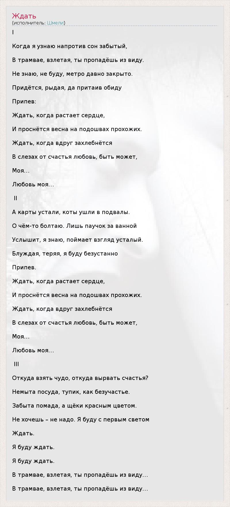 I Когда я узнаю напротив сон забытый, В трамвае, взлетая, ты пропадёшь из виду. Не знаю, не буду, метро давно закрыто. Придётся, рыдая, да притаив обиду Припев: Ждать, когда растает сердце, И проснётся весна на подошвах прохожих. Ждать, когда вдруг захлебнётся В слезах от счастья любовь, быть может, Моя… Любовь моя… II А карты устали, коты ушли в подвалы. О чём-то болтаю. Лишь паучок за ванной Услышит, я знаю, поймает взгляд усталый. Блуждая, теряя, я буду безустанно Припев. Ждать, когда растает сердце, И проснётся весна на подошвах прохожих. Ждать, когда вдруг захлебнётся В слезах от счастья любовь, быть может, Моя… Любовь моя… III Откуда взять чудо, откуда вырвать счастья? Немыта посуда, тупик, как безучастье. Забыта помада, а щёки красным цветом. Не хочешь – не надо. Я буду с первым светом Ждать. Я буду ждать. Я буду ждать. В трамвае, взлетая, ты пропадёшь из виду… В трамвае, взлетая, ты пропадёшь из виду…