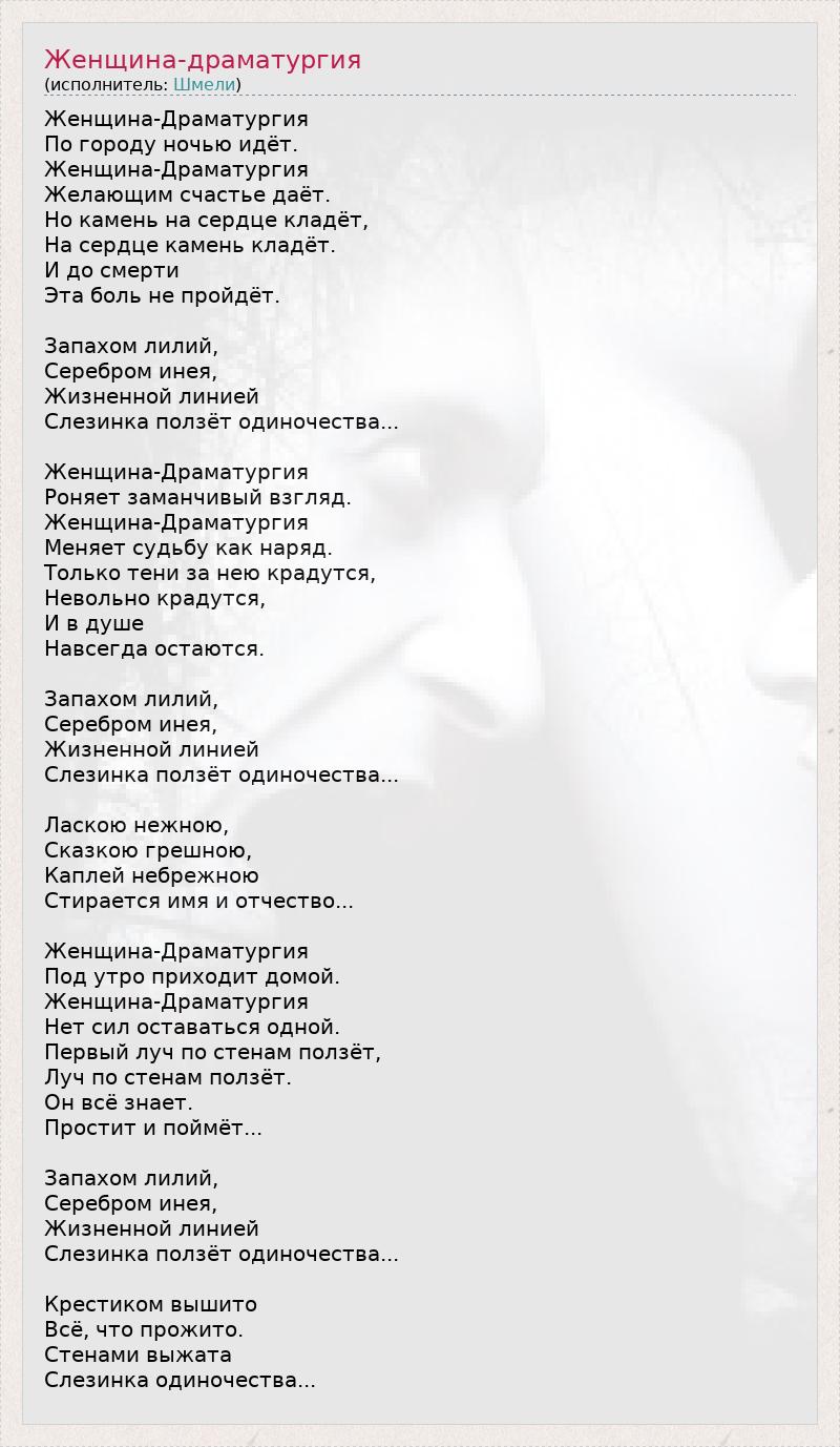 ГлавнаяИсполнителиШмелиЖенщина-драматургия