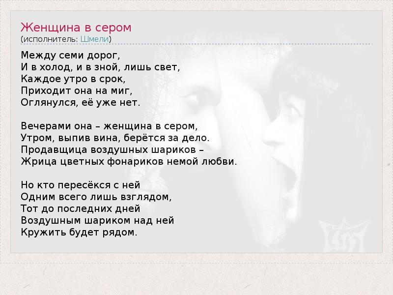 А как ты думаешь, о чем песня "Женщина в сером" ?