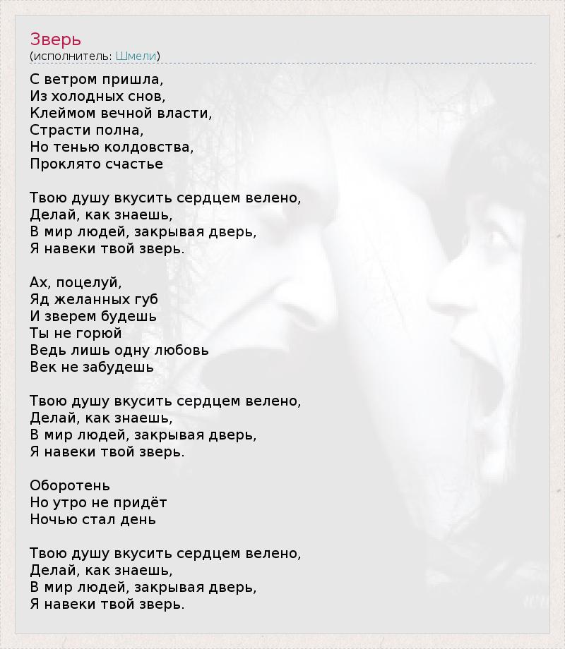 С ветром пришла, Из холодных снов, Клеймом вечной власти, Страсти полна, Но тенью колдовства, Проклято счастье Твою душу вкусить сердцем велено, Делай, как знаешь, В мир людей, закрывая дверь, Я навеки твой зверь. Ах, поцелуй, Яд желанных губ И зверем будешь Ты не горюй Ведь лишь одну любовь Век не забудешь Твою душу вкусить сердцем велено, Делай, как знаешь, В мир людей, закрывая дверь, Я навеки твой зверь. Оборотень Но утро не придёт Ночью стал день Твою душу вкусить сердцем велено, Делай, как знаешь, В мир людей, закрывая дверь, Я навеки твой зверь.