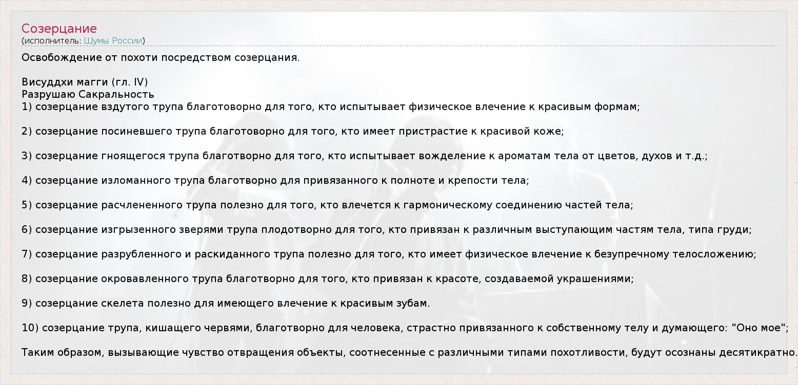 3) созерцание гноящегося трупа благотворно для того, кто испытывает вожделение к ароматам тела от цветов, духов и т.д.;