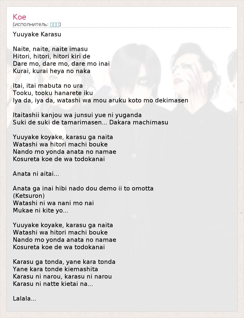 Плачь, плачь, я плачу Сам, сам, все сам Никого,никого , никого здесь В этой тёмной, тёмной комнате Больно,больно, за этими веками Далеко, ты ушла далеко Мне это не нрится, не не нравится. я уже не могу идти Эти жалкие чувства, поэтому они полностью исковерканы Я так люблю тебя,что не могу устоять...так что я жду На закате кричала ворона Я жду в тщеславии сам Я кричал твоё имя много раз Усталый голос не долетает до тебя Я хочу увидеть тебя... Я ни о чем не думал,пока тебя не было рядом У меня ничего нет Приди и забери меня... На закате кричала ворона Я жду в тщеславии сам Я кричал твоё имя много раз Усталый голос не долетает до тебя Ворона взлетела, взлетела с крыши Взлетела с крыши и исчезла Давай станем вороной, давай станем вороной Я хочу стать вороной и исчезнуть...