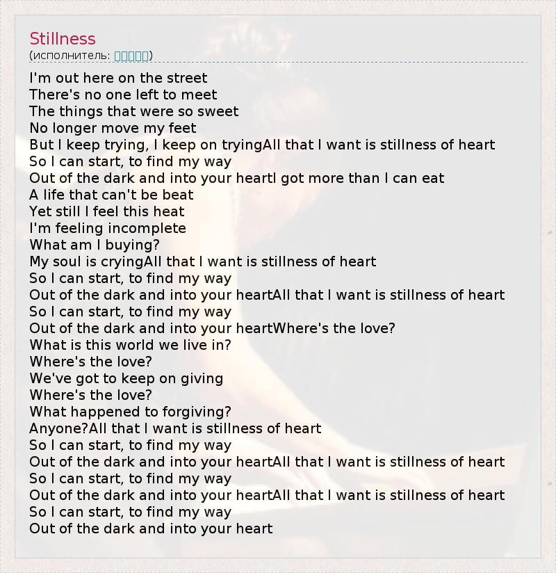 But I keep trying, I keep on tryingAll that I want is stillness of heart