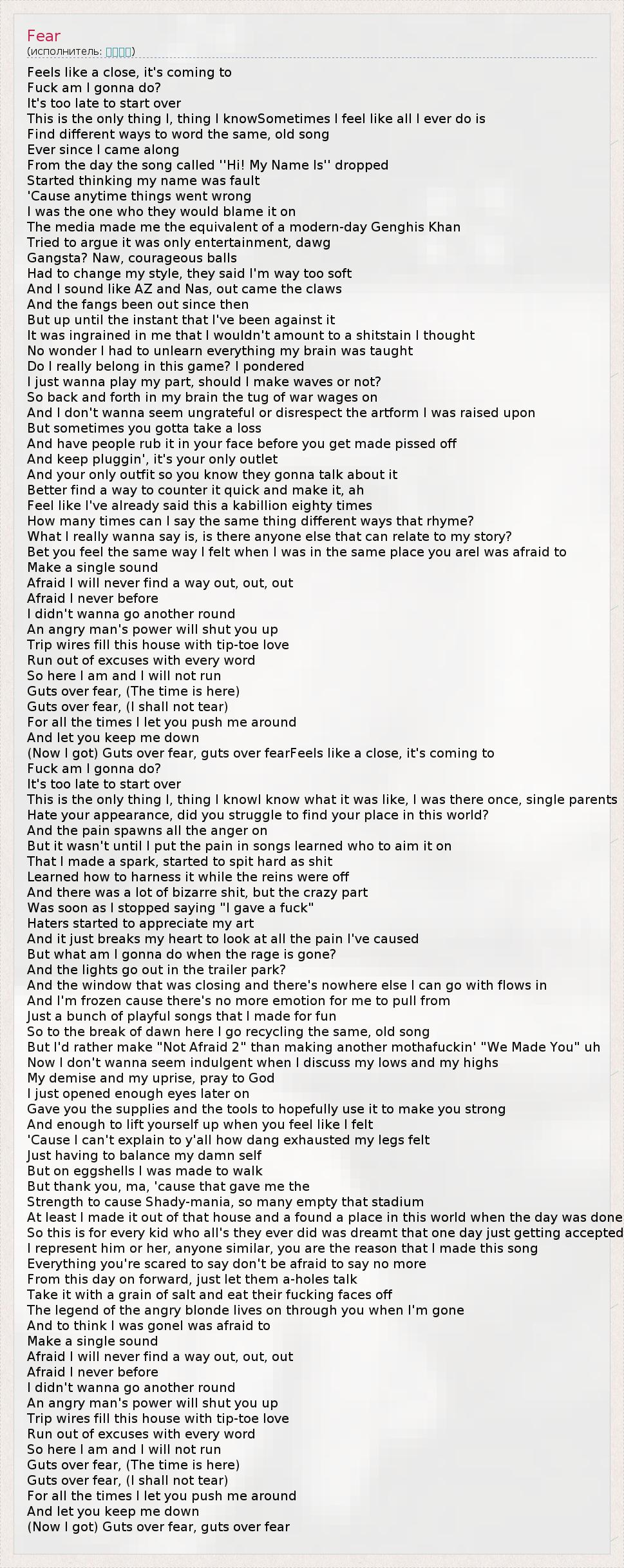 Feels like a close, it's coming to Fuck am I gonna do? It's too late to start over This is the only thing I, thing I knowSometimes I feel like all I ever do is Find different ways to word the same, old song Ever since I came along From the day the song called ''Hi! My Name Is'' dropped Started thinking my name was fault 'Cause anytime things went wrong I was the one who they would blame it on The media made me the equivalent of a modern-day Genghis Khan Tried to argue it was only entertainment, dawg Gangsta? Naw, courageous balls Had to change my style, they said I'm way too soft And I sound like AZ and Nas, out came the claws And the fangs been out since then But up until the instant that I've been against it It was ingrained in me that I wouldn't amount to a shitstain I thought No wonder I had to unlearn everything my brain was taught Do I really belong in this game? I pondered I just wanna play my part, should I make waves or not? So back and forth in my brain the tug of war wages on And I don't wanna seem ungrateful or disrespect the artform I was raised upon But sometimes you gotta take a loss And have people rub it in your face before you get made pissed off And keep pluggin', it's your only outlet And your only outfit so you know they gonna talk about it Better find a way to counter it quick and make it, ah Feel like I've already said this a kabillion eighty times How many times can I say the same thing different ways that rhyme? What I really wanna say is, is there anyone else that can relate to my story? Bet you feel the same way I felt when I was in the same place you areI was afraid to Make a single sound Afraid I will never find a way out, out, out Afraid I never before I didn't wanna go another round An angry man's power will shut you up Trip wires fill this house with tip-toe love Run out of excuses with every word So here I am and I will not run Guts over fear, (The time is here) Guts over fear, (I shall not tear) For all the times I let you push me around And let you keep me down (Now I got) Guts over fear, guts over fearFeels like a close, it's coming to Fuck am I gonna do? It's too late to start over This is the only thing I, thing I knowI know what it was like, I was there once, single parents Hate your appearance, did you struggle to find your place in this world? And the pain spawns all the anger on But it wasn't until I put the pain in songs learned who to aim it on That I made a spark, started to spit hard as shit Learned how to harness it while the reins were off And there was a lot of bizarre shit, but the crazy part Was soon as I stopped saying "I gave a fuck" Haters started to appreciate my art And it just breaks my heart to look at all the pain I've caused But what am I gonna do when the rage is gone? And the lights go out in the trailer park? And the window that was closing and there's nowhere else I can go with flows in And I'm frozen cause there's no more emotion for me to pull from Just a bunch of playful songs that I made for fun So to the break of dawn here I go recycling the same, old song But I'd rather make "Not Afraid 2" than making another mothafuckin' "We Made You" uh Now I don't wanna seem indulgent when I discuss my lows and my highs My demise and my uprise, pray to God I just opened enough eyes later on Gave you the supplies and the tools to hopefully use it to make you strong And enough to lift yourself up when you feel like I felt 'Cause I can't explain to y'all how dang exhausted my legs felt Just having to balance my damn self But on eggshells I was made to walk But thank you, ma, 'cause that gave me the Strength to cause Shady-mania, so many empty that stadium At least I made it out of that house and a found a place in this world when the day was done So this is for every kid who all's they ever did was dreamt that one day just getting accepted I represent him or her, anyone similar, you are the reason that I made this song Everything you're scared to say don't be afraid to say no more From this day on forward, just let them a-holes talk Take it with a grain of salt and eat their fucking faces off The legend of the angry blonde lives on through you when I'm gone And to think I was goneI was afraid to Make a single sound Afraid I will never find a way out, out, out Afraid I never before I didn't wanna go another round An angry man's power will shut you up Trip wires fill this house with tip-toe love Run out of excuses with every word So here I am and I will not run Guts over fear, (The time is here) Guts over fear, (I shall not tear) For all the times I let you push me around And let you keep me down (Now I got) Guts over fear, guts over fear