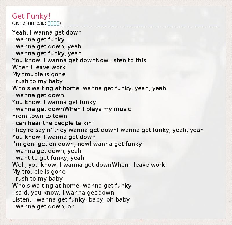 Yeah, I wanna get down I wanna get funky I wanna get down, yeah I wanna get funky, yeah You know, I wanna get downNow listen to this When I leave work My trouble is gone I rush to my baby Who's waiting at homeI wanna get funky, yeah, yeah I wanna get down You know, I wanna get funky I wanna get downWhen I plays my music From town to town I can hear the people talkin' They're sayin' they wanna get downI wanna get funky, yeah, yeah You know, I wanna get down I'm gon' get on down, nowI wanna get funky I wanna get down, yeah I want to get funky, yeah Well, you know, I wanna get downWhen I leave work My trouble is gone I rush to my baby Who's waiting at homeI wanna get funky I said, you know, I wanna get down Listen, I wanna get funky, baby, oh baby I wanna get down, oh