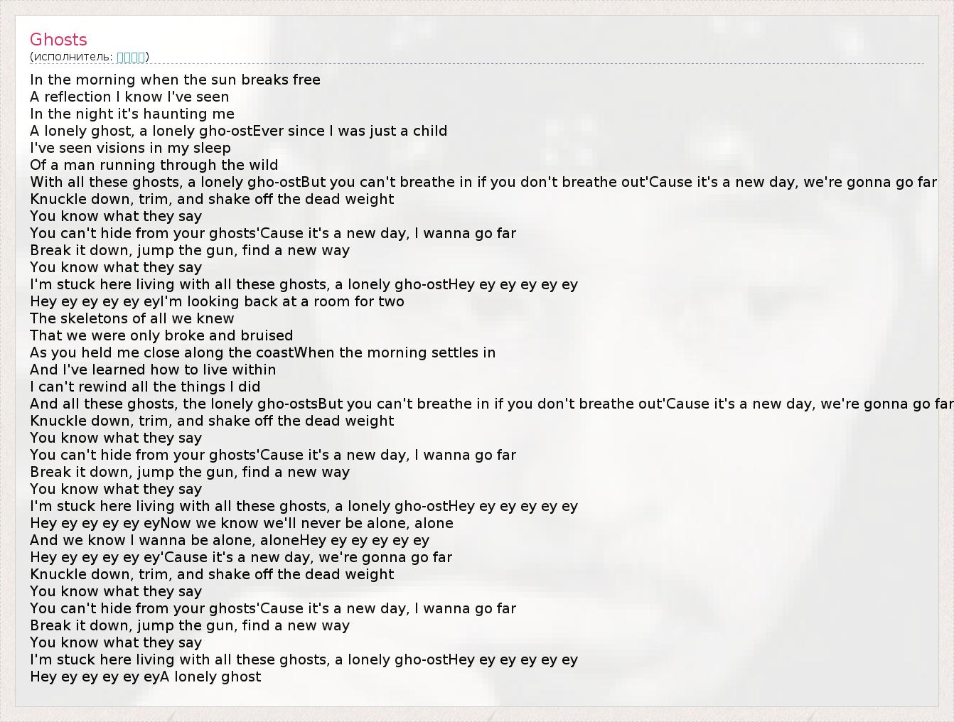 In the morning when the sun breaks free A reflection I know I've seen In the night it's haunting me A lonely ghost, a lonely gho-ostEver since I was just a child I've seen visions in my sleep Of a man running through the wild With all these ghosts, a lonely gho-ostBut you can't breathe in if you don't breathe out'Cause it's a new day, we're gonna go far Knuckle down, trim, and shake off the dead weight You know what they say You can't hide from your ghosts'Cause it's a new day, I wanna go far Break it down, jump the gun, find a new way You know what they say I'm stuck here living with all these ghosts, a lonely gho-ostHey ey ey ey ey ey Hey ey ey ey ey eyI'm looking back at a room for two The skeletons of all we knew That we were only broke and bruised As you held me close along the coastWhen the morning settles in And I've learned how to live within I can't rewind all the things I did And all these ghosts, the lonely gho-ostsBut you can't breathe in if you don't breathe out'Cause it's a new day, we're gonna go far Knuckle down, trim, and shake off the dead weight You know what they say You can't hide from your ghosts'Cause it's a new day, I wanna go far Break it down, jump the gun, find a new way You know what they say I'm stuck here living with all these ghosts, a lonely gho-ostHey ey ey ey ey ey Hey ey ey ey ey eyNow we know we'll never be alone, alone And we know I wanna be alone, aloneHey ey ey ey ey ey Hey ey ey ey ey ey'Cause it's a new day, we're gonna go far Knuckle down, trim, and shake off the dead weight You know what they say You can't hide from your ghosts'Cause it's a new day, I wanna go far Break it down, jump the gun, find a new way You know what they say I'm stuck here living with all these ghosts, a lonely gho-ostHey ey ey ey ey ey Hey ey ey ey ey eyA lonely ghost